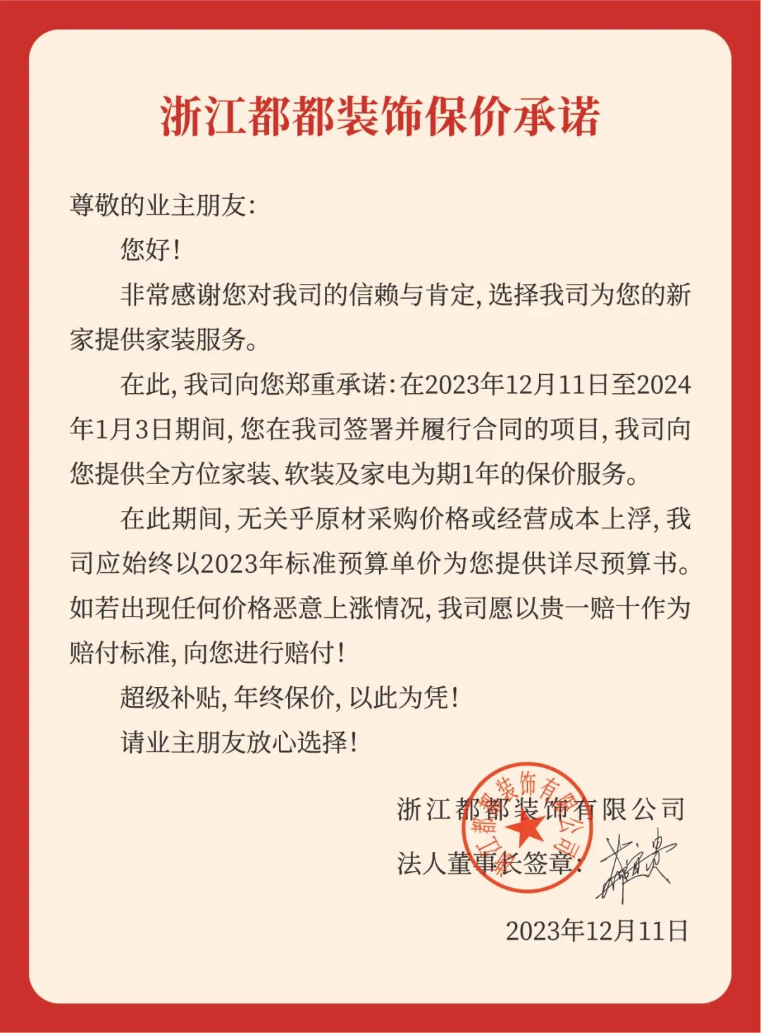 「跨年保价」,重磅来袭!董事长郑重承诺:活动期间选择都都装饰,我们将提供为期1年的保价服务,用2023年的价格,装2024年的房子!