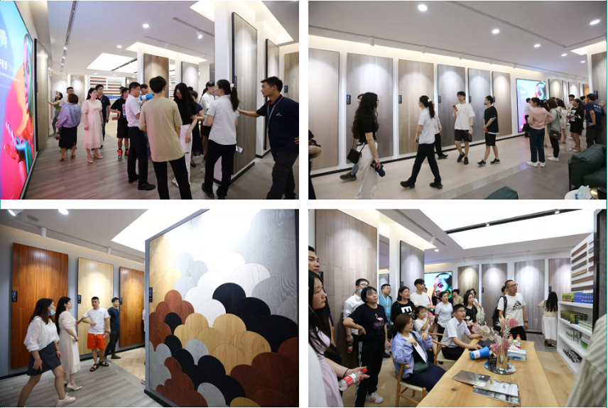 展厅内陈列了涵盖实木地板、实木地暖地板、实木复合地板、强化地板全品类地板,产品品类丰富,讲解员对新品流光环保地板进行了详细讲解。