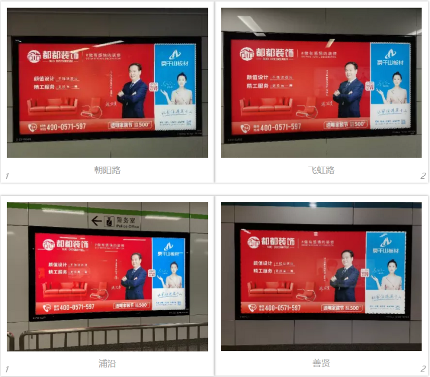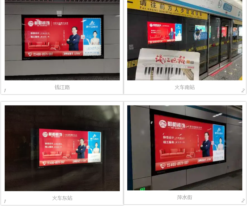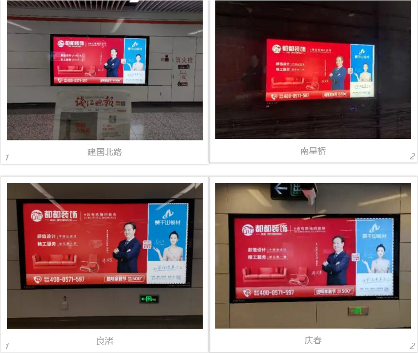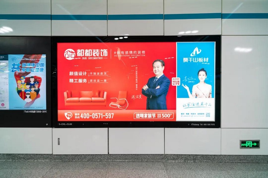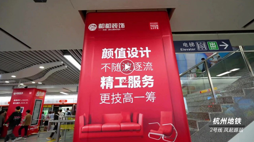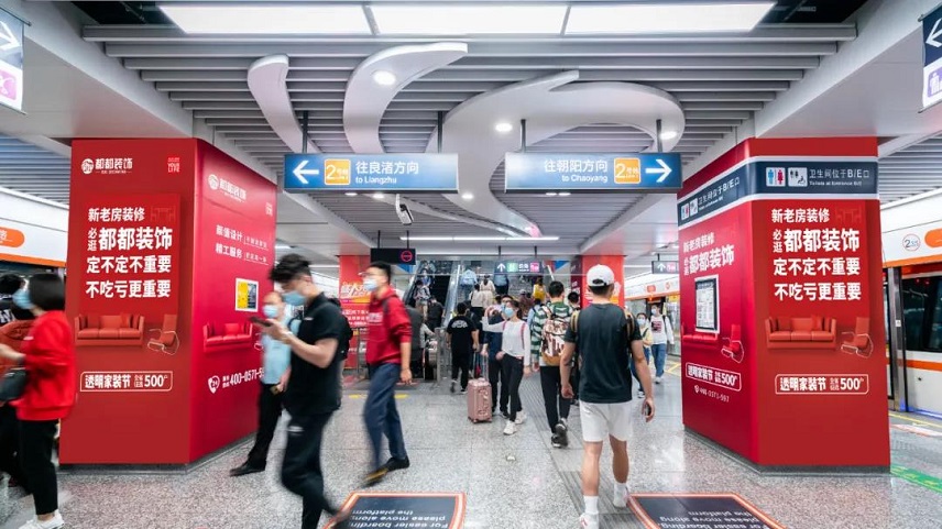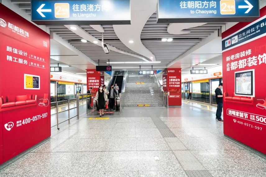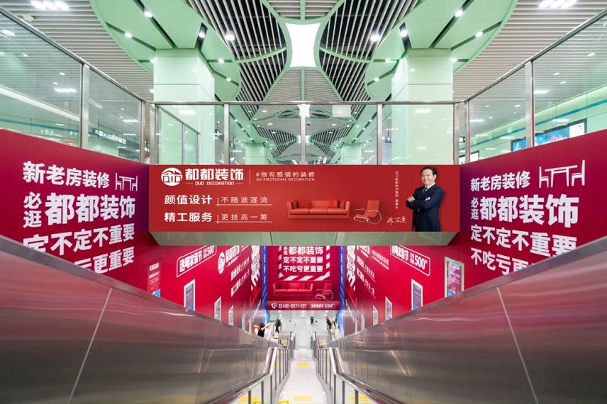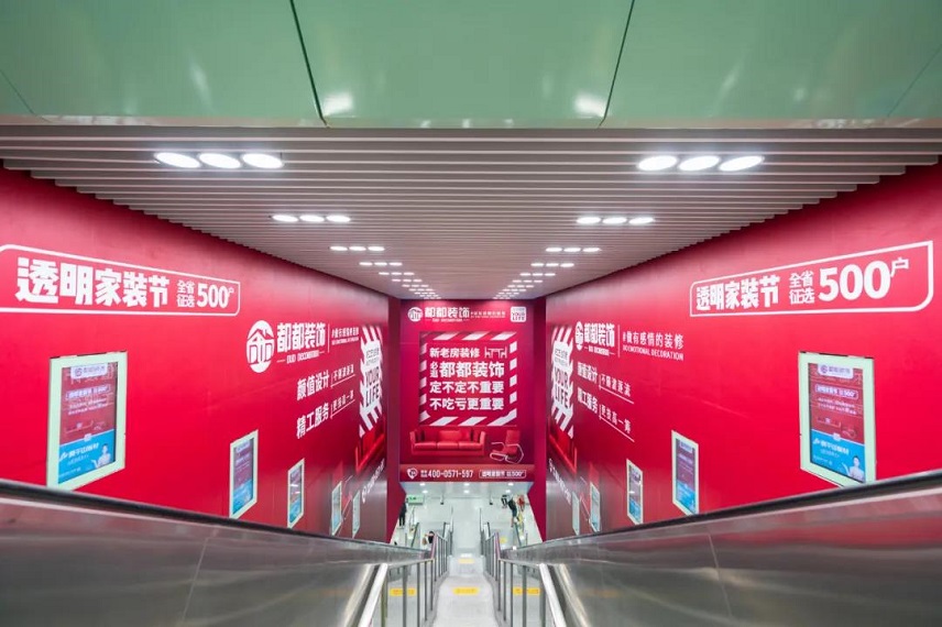 五月透明家装节已盛大开启,都都装饰包揽杭州地铁人气路线,精准锁定换乘站地铁2号线、5号线、1号线,人民广场站、凤起路站全线覆盖站厅、灯箱、包柱、电子屏,高饱和度的红色和文字只为吸引你的目光。