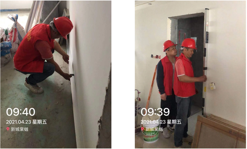 墙地面平整度检查/ Check 利用内外直角检测尺和射线仪器检测,检测阴阳角墙砖贴的是否方正,检测墙面垂直度和水平度,确保在标准施工范围内,对于需要微调的部分,现场指出并开记录改正单,改正完毕再进行检查。