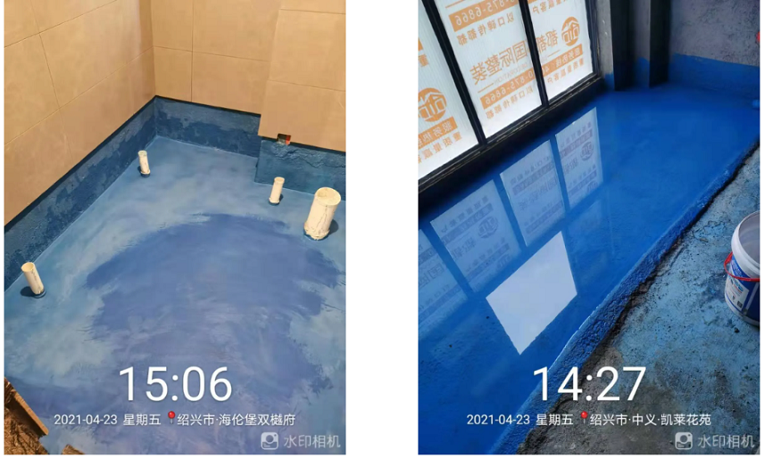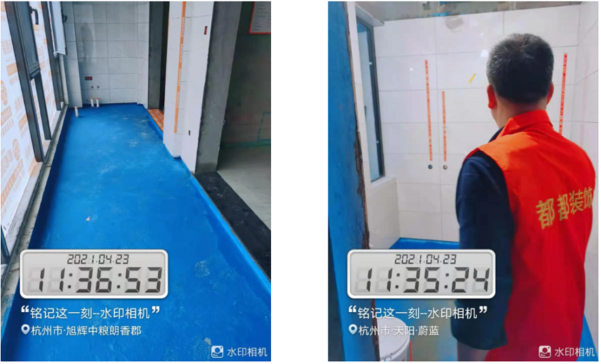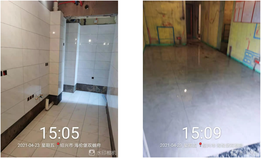 防水检查/ Check 地面防水,检查防水施工质量,做好卫生工作,阴角扫清,保证不会有漏刷,确保防水施工完好,并且在面盆、马桶下水管的根部及阴角处多刷2遍,24小时闭水试验,24小时候到楼下看有无渗漏,确保无渗漏再进行下一步的施工