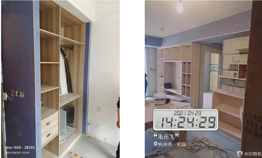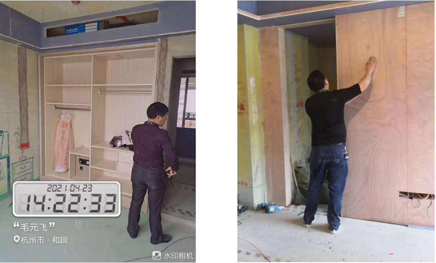 木工阶段/ Check 门套基层制作工艺、衣柜制作工艺、成品木柜定制标准均严格按照公司标准。