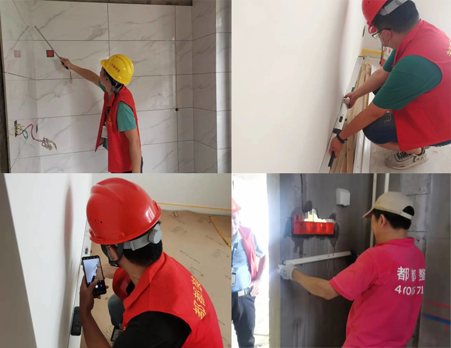 使用辅助工具,检查空鼓和夹角度数,高质量源于一分一毫的抠细节。仔细核对图纸,与现场施工情况进行对照检查。