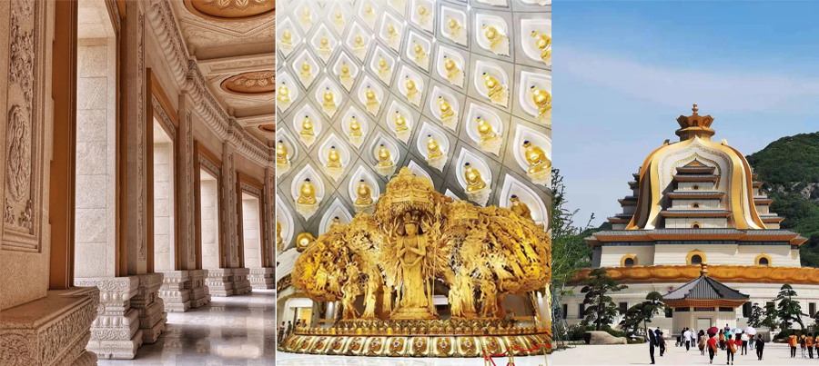 在普陀山,人与佛的距离近在咫尺。观音法界综合中国传统楼阁特色与现代高层建筑技术,整体建筑宏伟庄严,给人以强烈的视觉冲击,室外充满禅意的园林空间,一草一木均传导着与自然和谐共存的生命理念。设计师在这里学习建筑、学习纹路设计、灯光设计。