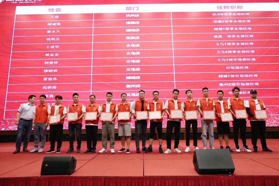 管理层任聘:杭州8部事业部经理-王建、建德2部事业部经理-储诚锋、越城1部事业部经理-蔡永久、慈溪1部事业部经理-钱明杰、义乌1部事业部经理-王进华、义乌3部事业部经理-曾金龙、义乌1部市场部经理-柯建林、 义乌市场部经理-缪晓林、越城1部市场部经理-雷前苏、衢州2部市场部经理-祝俊清、义乌市场部经理-章敦、建德1部市场部经理-吴志堂、建德1部市场部经理-傅嘉康。