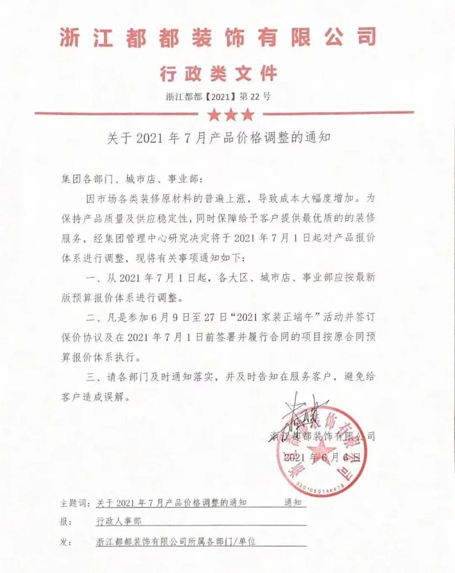 在各家装修公司发过涨价通知之后,都都装饰也发出了涨价通知的文件。