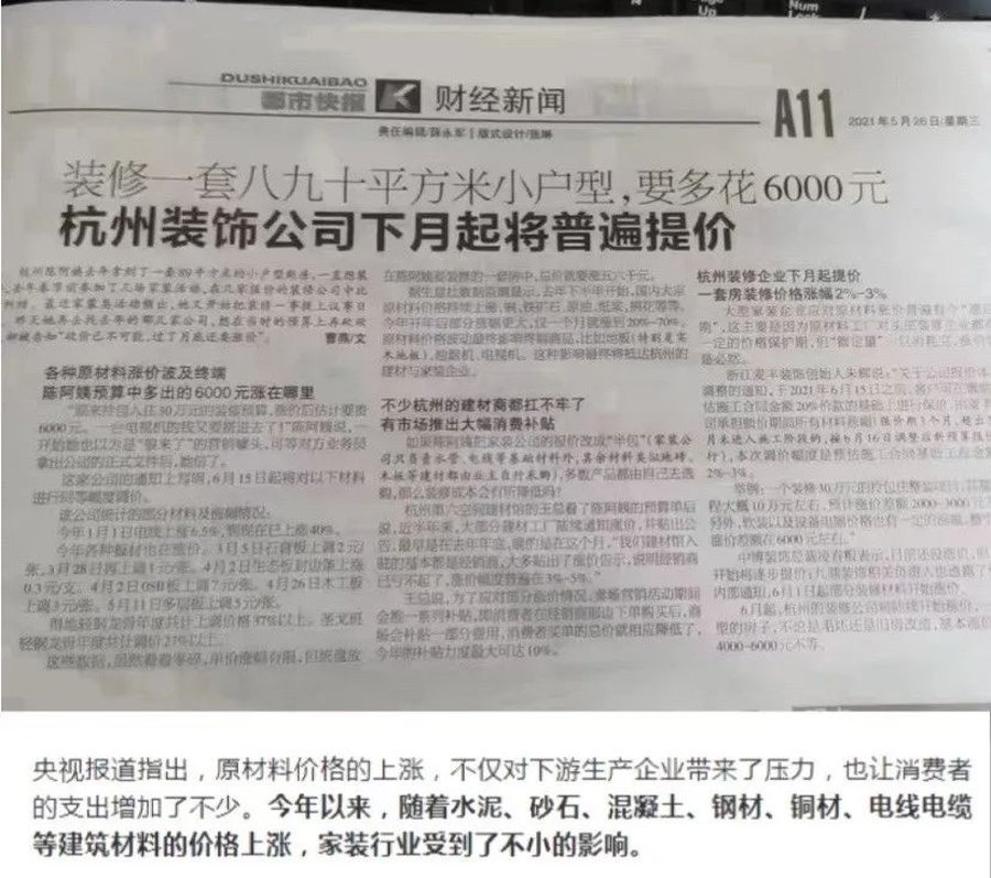 金三银四之后的五月,钢材市场的上涨趋势不仅没有丝毫收敛,反而是越发不可收拾,上演疯狂冲高走势,无数装修原材料也都跟着上涨。好多正在观望的业主纷纷感叹:晚装修多花万元!