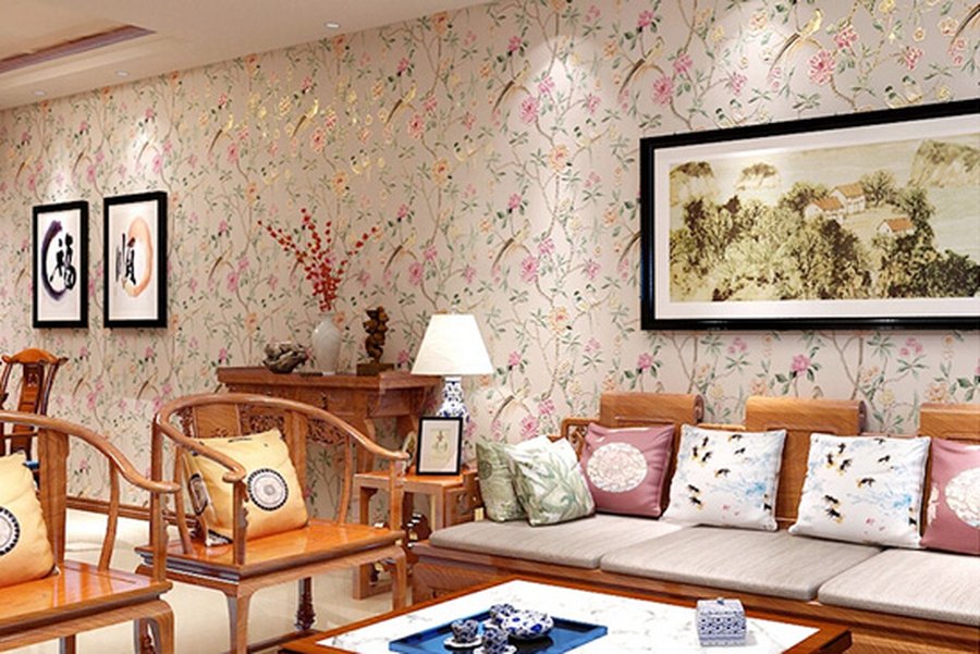 工笔画的绘画方式让整面墙的花鸟变得鲜活起来,带着中式工笔画特有的细致,与室内的中式家具和装修相映成趣,带来一股宁静的禅意。