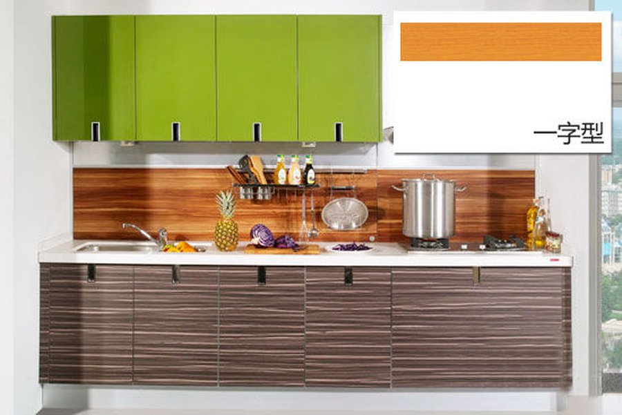 一字橱柜:一字形橱柜适合于面积小、狭长的厨房,适合中小家庭或者同一时间只有一人工作的住房。这种橱柜让烹饪工作安排在一直线上,显得更加紧凑。
