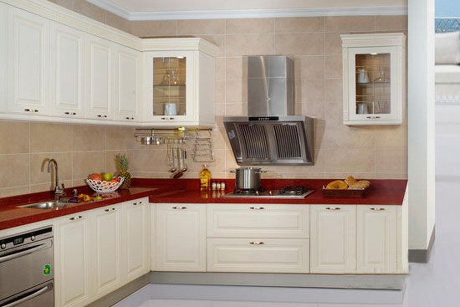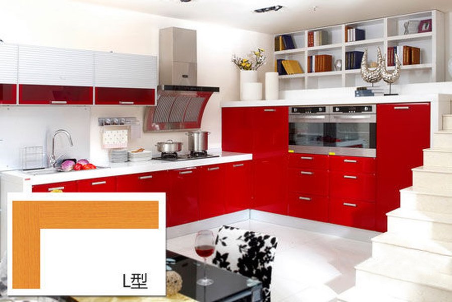 L型橱柜:L型橱柜同样适合于小空间,方形的厨房或者厨房长宽比例接近的适合使用,一般的小户型,希望更加节省空间,在满足上述条件的情况下可选用。这种橱柜让厨房工作集中在一个三角区域内,十分便利。