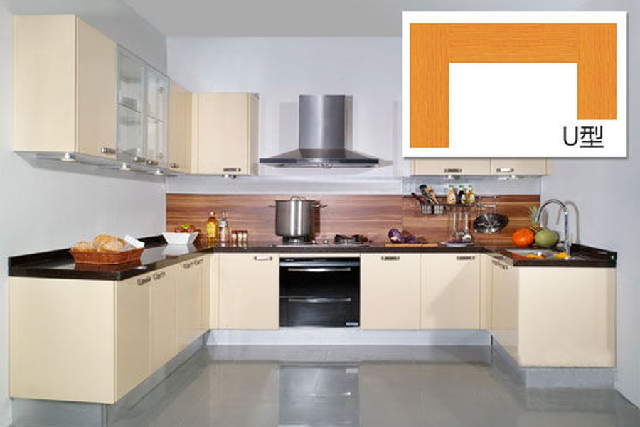 U型橱柜:U型橱柜适合于空间较大的厨房,一般方形的厨房最为合适。这种橱柜可最大限度地利用空间进行烹饪和储物,2-3人可同时在厨房工作而互不干扰,需要注意,U型橱柜必须满足两排相对的柜子之间保持至少120cm的距离。