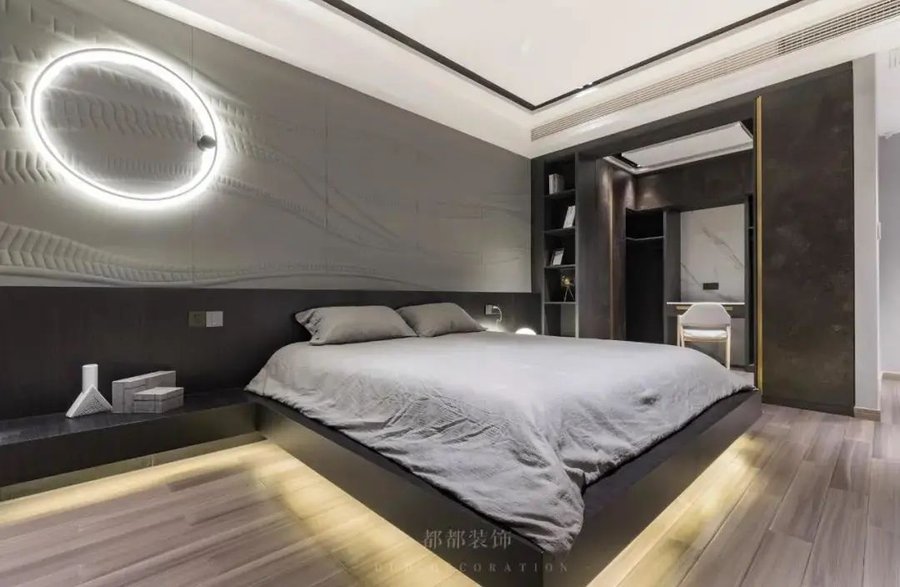 卧室的照明其实可以分为三部分:整体照明、枕边局部照明和衣柜局部照明。整体照明的主灯功率不宜选择太大。如果卧室比较大,可以适当地在吊顶处增加灯带,提升整体照明效果。枕边局部照明,一般是为了方便床上活动以及起夜而设置的,光线不用太强,用一盏小台灯、落地灯或者壁灯都行。此外,如果你的卧室里有美美的地毯,别忘记在床下贴一条灯带,可以将氛围烘托得更完美哦!