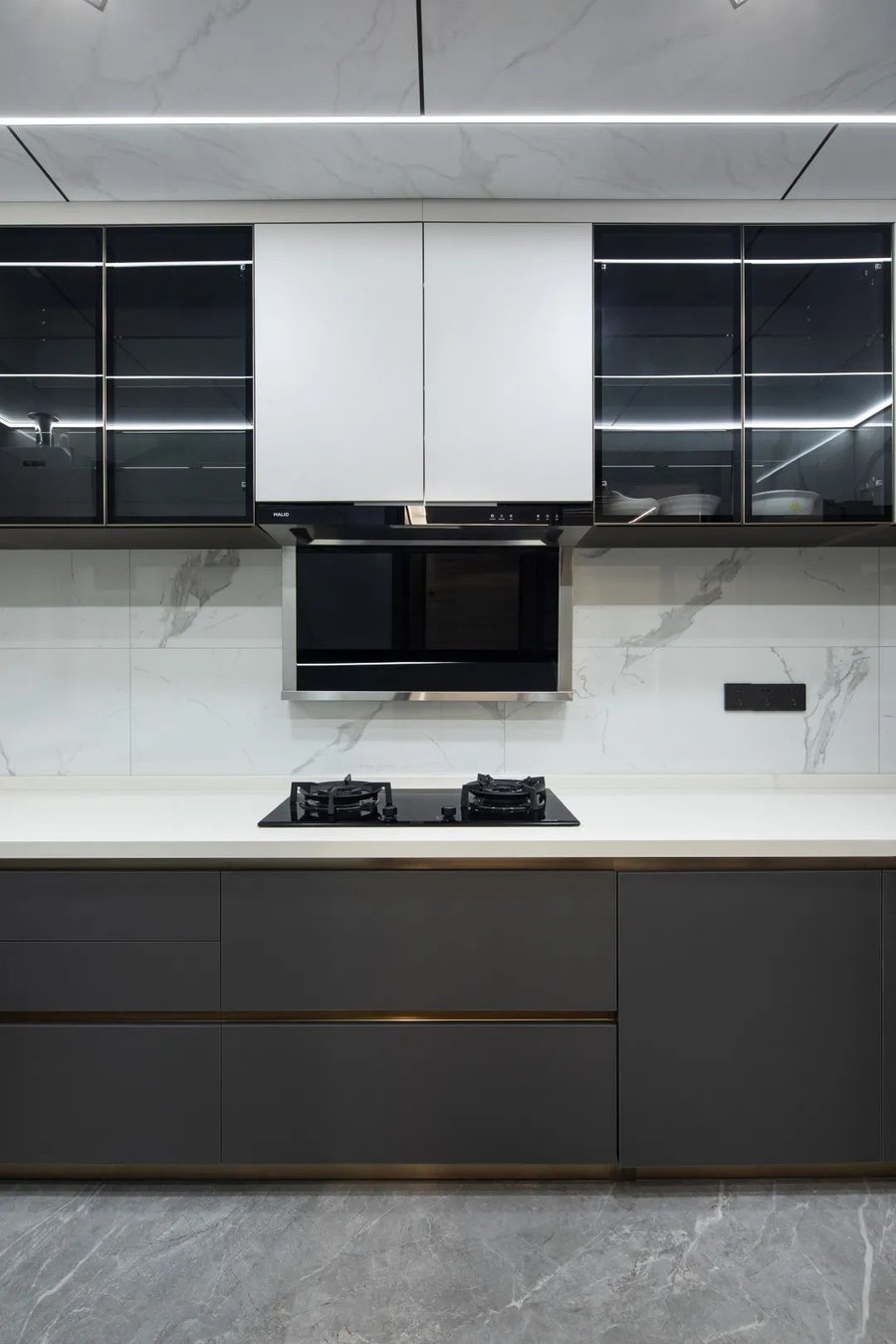 在装修初期,可以提前和设计师一起,规划好电器的位置,设计成嵌入式,不仅颜值高,严丝合缝的设计也避免了空间浪费,出现卫生死角。