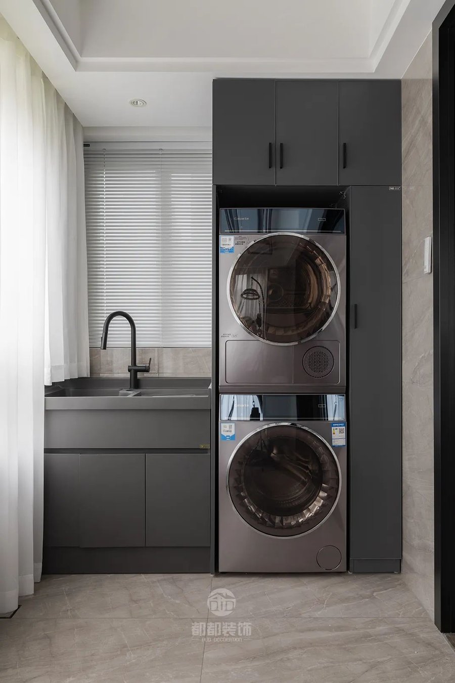 靠墙的一面打满定制柜,留出洗衣机和烘干机的尺寸,收纳能力直接拉满。旁边放拖把扫帚甚至家用小梯子等,上面的柜子还能放上工具箱等不常用到的杂物,实用性MAX!