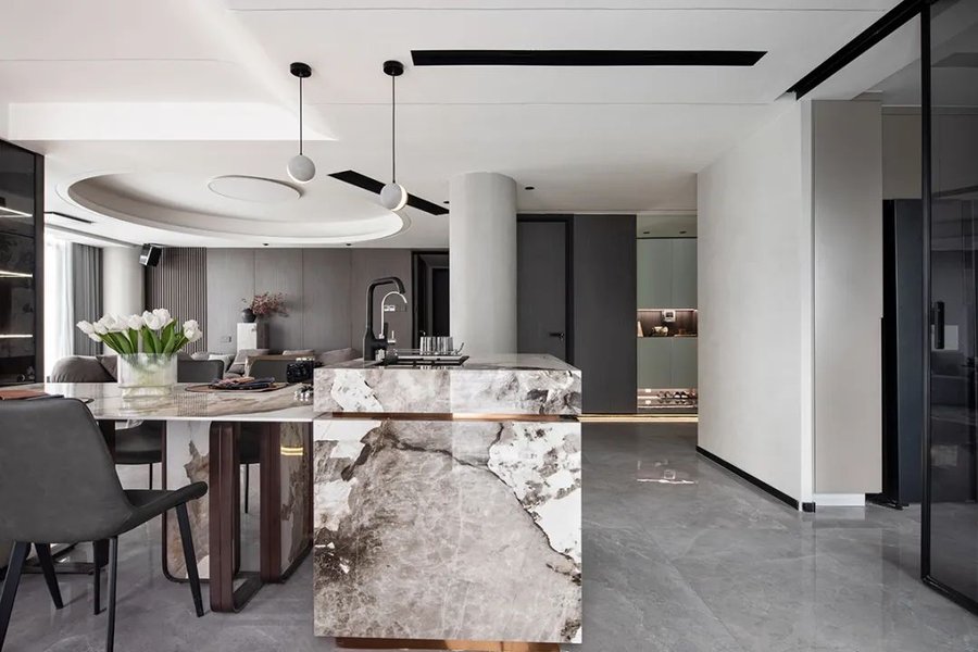 天然的大理石价格昂贵,花大价钱买回家之后也不会成天盯着看,预算不高时选用简单的石膏线或整面墙做成收纳柜更实用。
