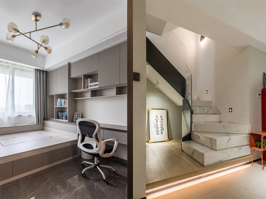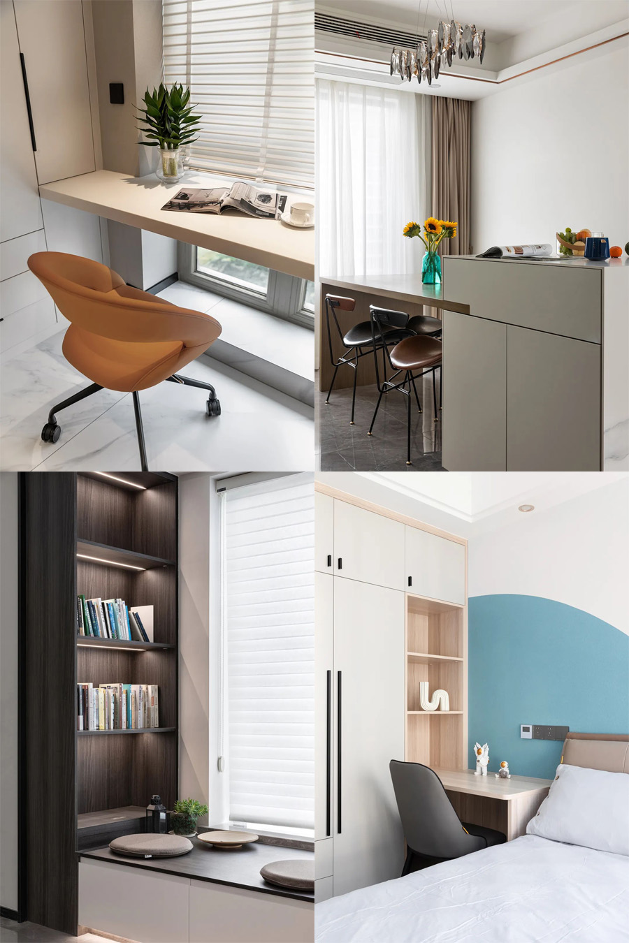 一些多功能的桌子、岛台等,也都可以通过全屋定制来实现。比如改小飘窗,做衣柜书桌一体柜,多功能工作台等等。