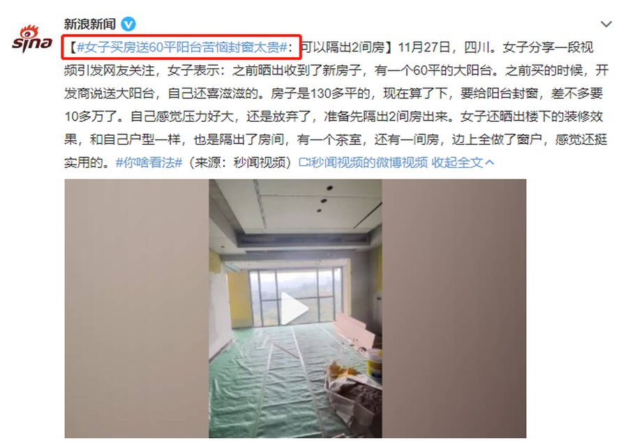 但其实对于新闻中的那位女士来讲,开发商送60平阳台的隐藏条件也很明显,可能是小区有要求要封阳台,所以10多万的封阳台费用让她犯了难。