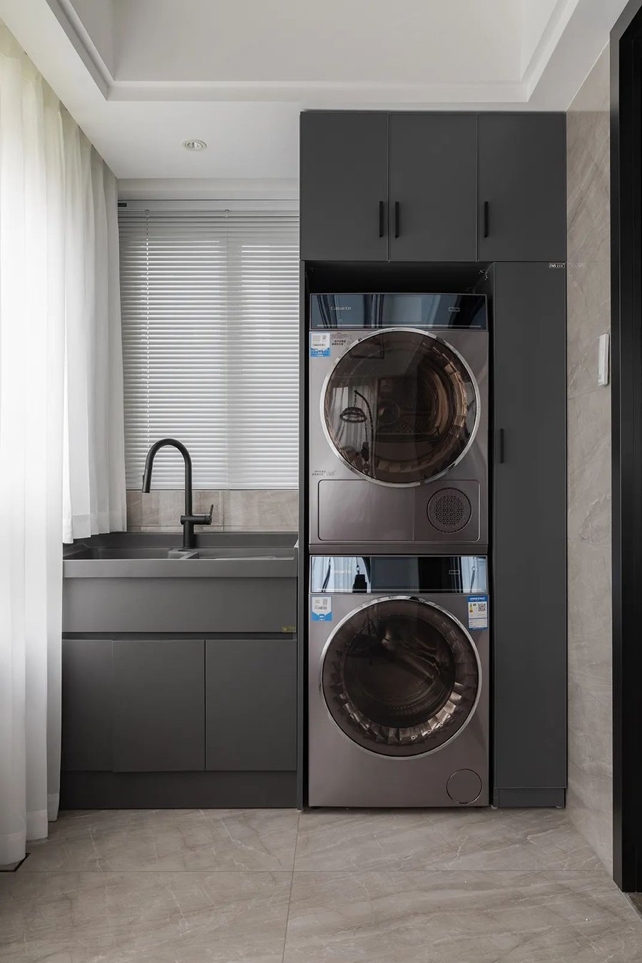靠墙的一面打满定制柜,留出洗衣机和烘干机的尺寸,收纳能力直接拉满。旁边放拖把扫帚等工具,上面的柜子还能放上工具箱等不常用到的杂物,实用性MAX!