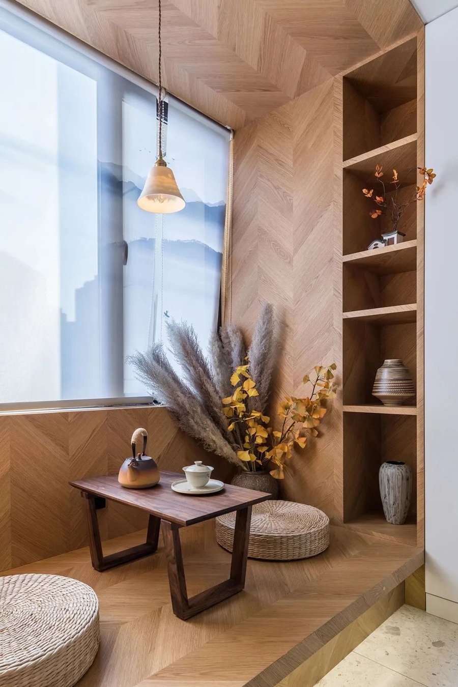那如果阳台比较大的话,就可以单独隔出来一个休闲室,品茶看书、独坐会友皆可。