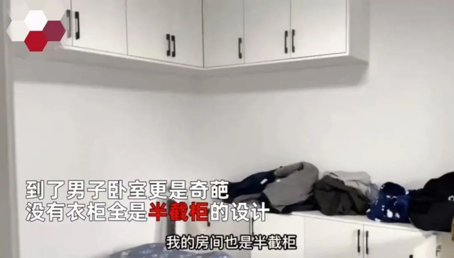 另一个卧室的设计更是离谱,柜子全部是半截柜,仿佛是放错了位置的厨房。