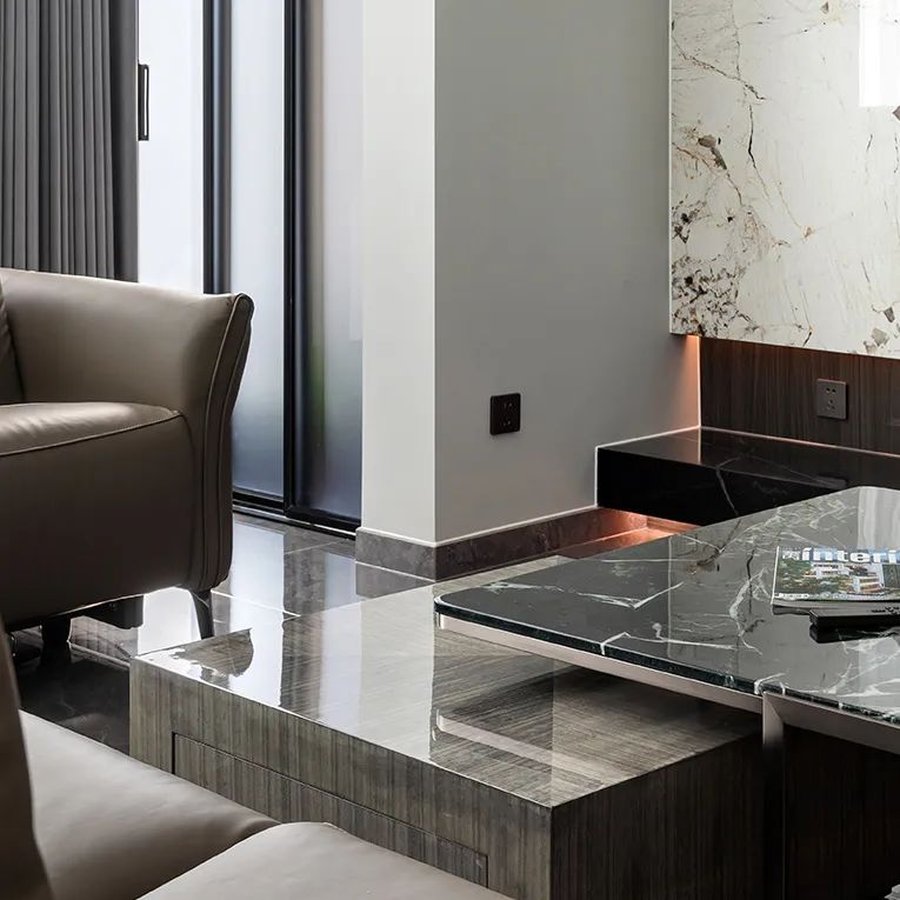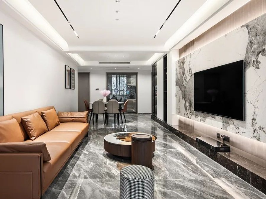 比如下面这几个案例中,有和地台用同一种花色的,也有和定制柜同一种颜色的。