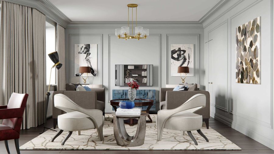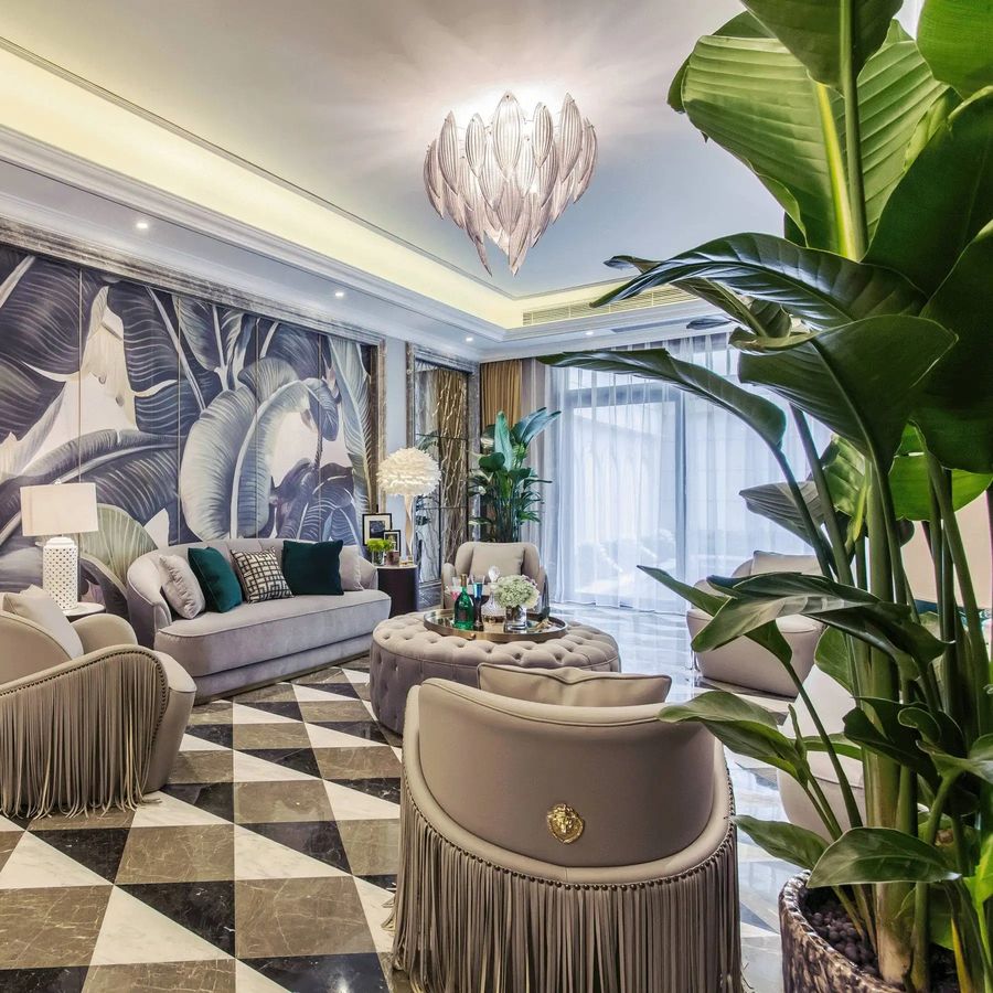 家具和布艺软装进行对比也是个好办法,比如室内色调以浅色为主,抱枕、窗帘、地毯等布艺软装的颜色接近,而沙发和椅子则颜色较鲜明,这样对比层次感强烈。再通过艺术壁画、特色吊灯等装饰品,提升整个空间的艺术品味。