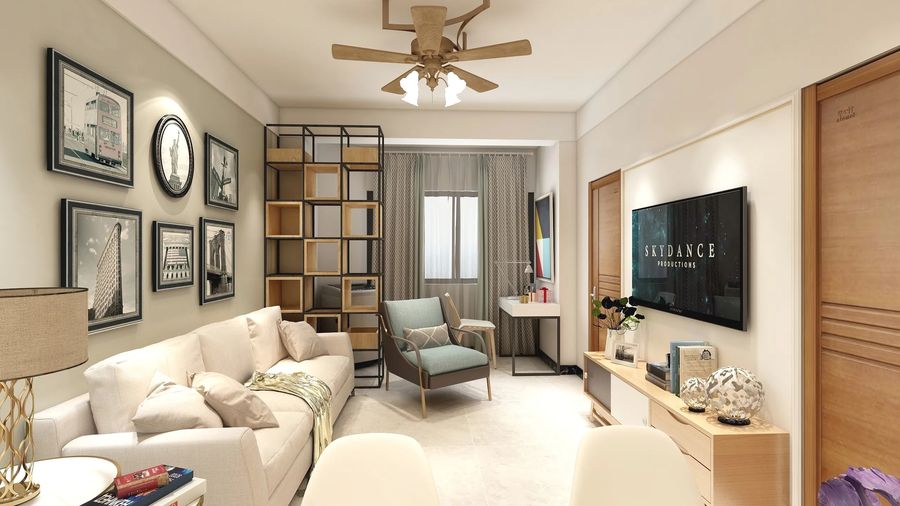众所周知,在美学中有黄金比例分割一说,黄金比例是非常能体现出美感。我们可以合理利用其特点来布局软装,例如:将挂画按照比例高度布置,在视觉上更能体现出美感;将工艺品、摆件按照比例去摆放,放在偏左或偏右的位置可以让视觉效果灵动很多。当然,沙发和背景墙还是需要正对齐的。