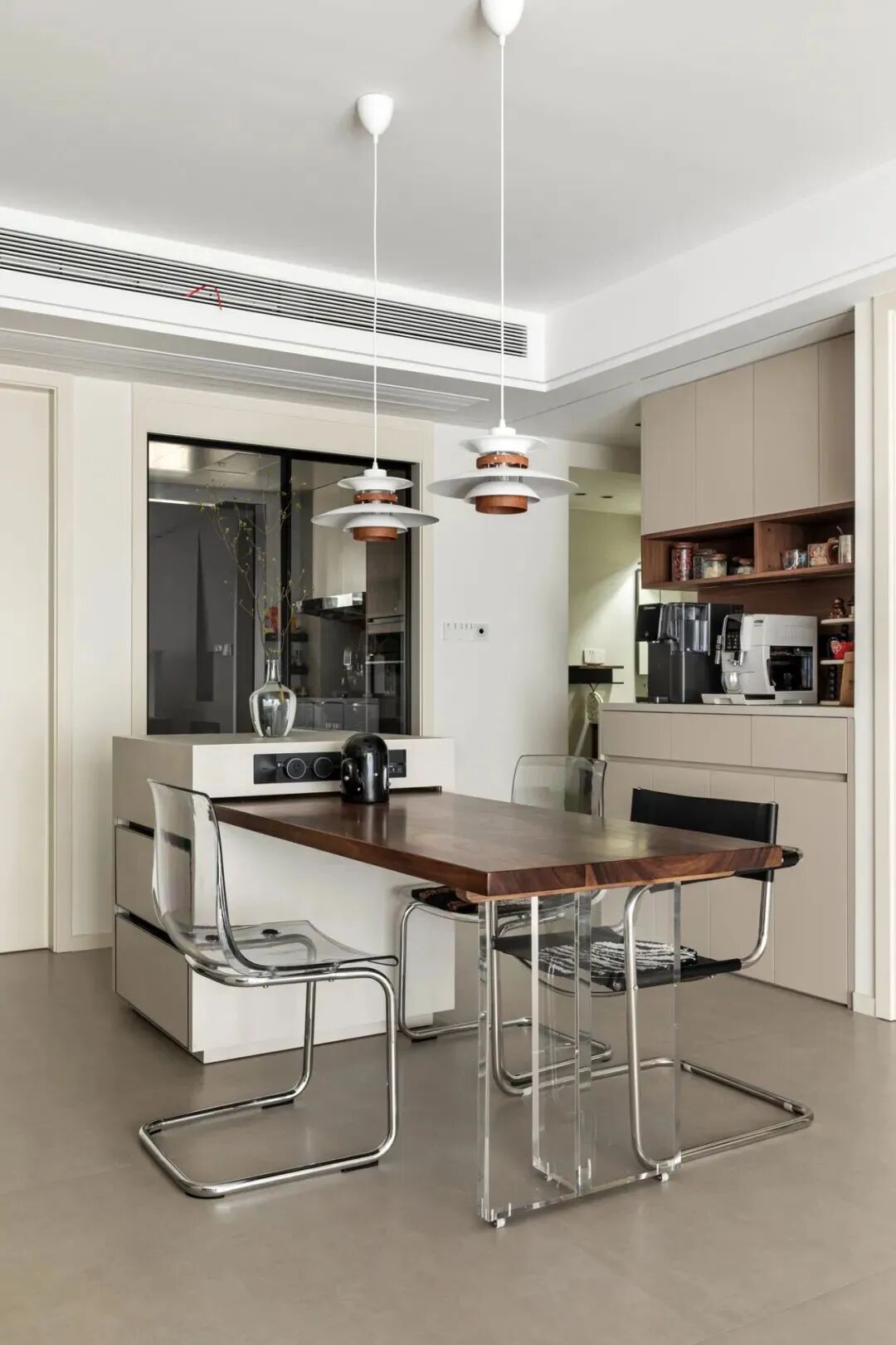 从视觉上看,餐岛一体化消除了传统隔断带来的空间分割感,使整个空间显得更加开阔和通透。
