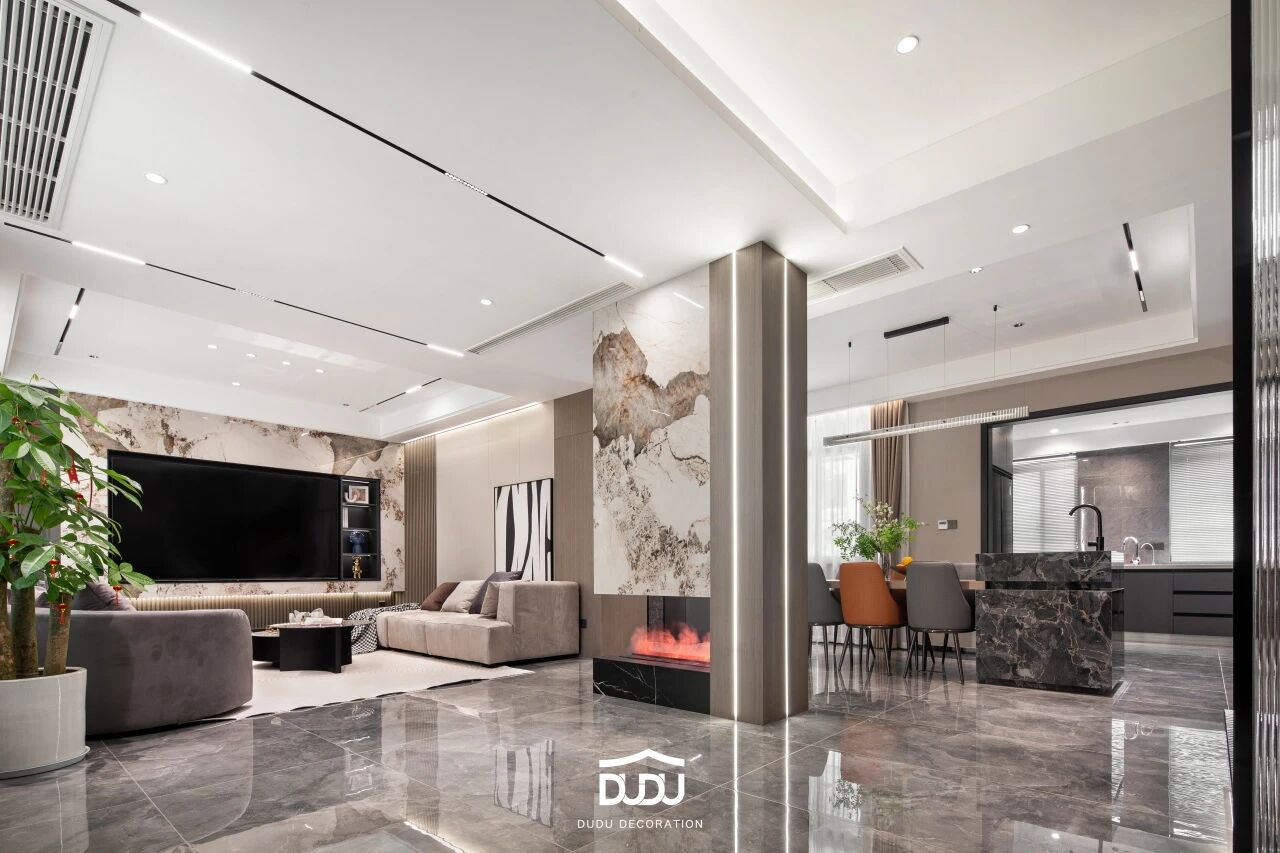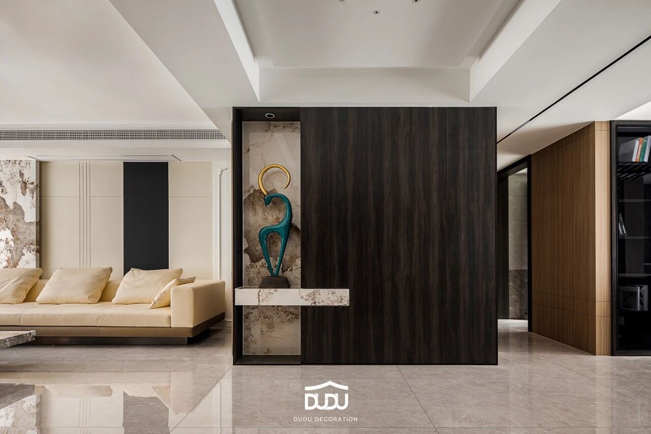 纵深线条的长度往往被刻意拉长,针对现代商品房有限的层高,在实际的落地过程中,我们会通过通顶的柜体或加高的门洞来强化这一效果,营造空间的挺拔感与向上延伸的气势。